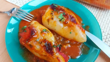 Pržiti par minuta. Dodati na kocne oljušten paradajz, seckan beli luk, so biber i peršunov list. Paprike oprati izvaditi semenke . Pleh podmazati uljem pa puniti nadevom paprike i redjati. Zatvarati sa kolutovima paradajza.
