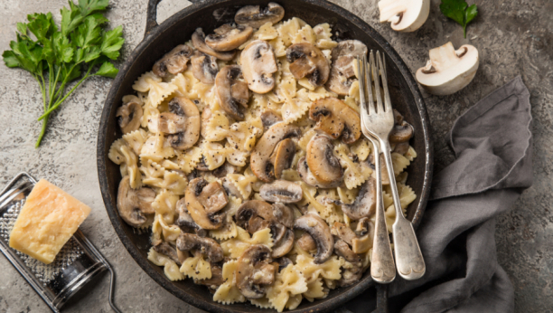 Skuvajte testeninu, po upustvu na kesi. Na maslinovom ulju kratko propržite beli luk i jedan struk praziluka, pa kad zamiriše, dodajte iseckane pečurke. Začinite po ukusu, dinstajte pečurke dok sva voda ne ispari, dodajte kiselu pavlaku i dobro promešajte.