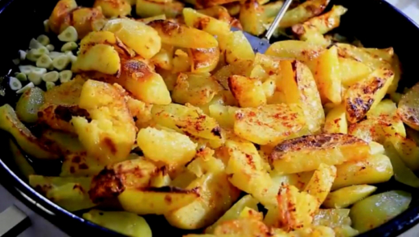 Izmešamo ulje, so, začinsku papriku i izgnječeni beli luk, i svaki krompir umočmo u ulje da se naulji sa svih strana.
