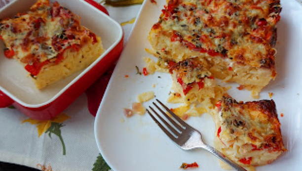 Pola smese sipati u testeninu pa izmešati. Sipati u podmazan pleh rasporediti pa sipati ostatak testenine. Preko rasporediti luk i papriku pa površno izmešati.