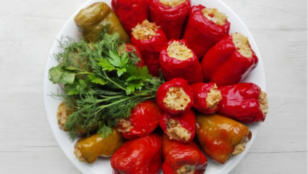 Tepsiju podmazati sa kašikom masti. Paprike puniti do vrha i zatvoriti kolutom paradajza. Ređati u tepsiju.