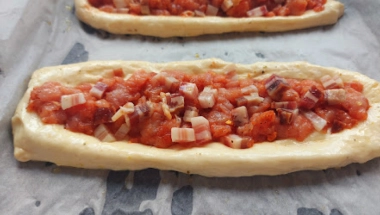 Izmešati. Po pravilu ovo treba napraviti bar sat vremena ranije.. Loptice razvući u manje čamce pa u sredinu poredjati meso. Po želji može se dodati i malo kačkavalja.