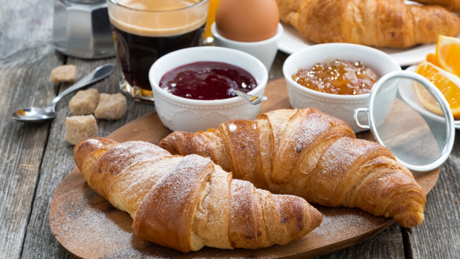 Sve skupa istanjiti u krug. Debljine oko 0.5cm iseći na 12 delova za veće ili 16 delova. Za manje kroasane: Filovati nadevom po želji slatki ili slani. Saviti kiflice pritisnuti malo testo oko fila da ne iscuri tokom pečenja. Kroasane staviti u pleh prekrivenim papirom ili podmazati uljem sa razmucen da ima prostora da naraste tokom pečenja.