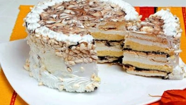 Umutit 3 jajeta sa 1 šoljom šećera da bude gusto, dodati ulje, brašno i prašak za pecivo. Masu staviti u pleh veličine 20x35 cm, prethodno obložen papirom. Umutiti 4 belanca sa 6 kašika šećera, dodati 4 kašike mlevenih oraha. Masu staviti u pleh preko mase od jaja. Pažljivo rasporediti i poravnati da se mase ne sjedine. Peći na 160 stepeni 40 minuta. Ispeći još jednu ovakvu koru, tako da imamo 2 kore. Istopiti 200 g čokolade za kuvanje i 6 kašika ulja, preliti obe kore i ostaviti da se ohladi.