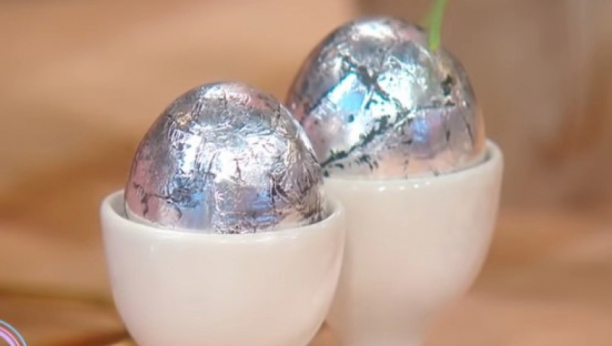 Dok su jaja još topla, ali ne vrela, premažite ih belancetom, sačekajte jedan minut i onda pažljivo nalepite komadiće folije. Dobro pritisnite kako bi se folija zalepila za belance, a kada se jaje potpuno osuši, dobićete efektna, srebrna jaja.