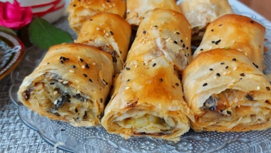 Koru prvu poprskati uljem, preko nje još dve pa na treću ubaciti 2-3 kašike šampinjona i rasporediti po kori.Saviti ivice i uviti u rolat.