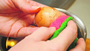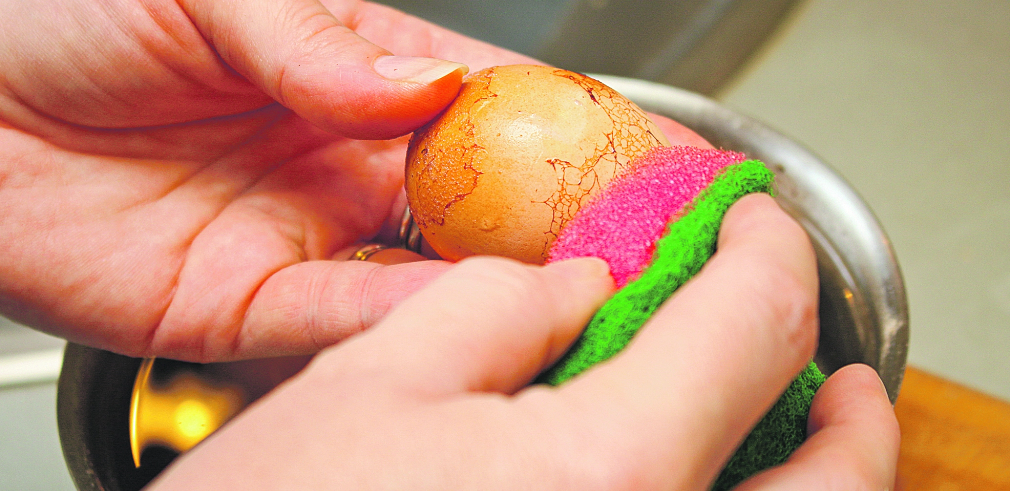 Potom smanjite ringlu, ali ostavite da vri.Pojaviće se pena koju skidajte cediljkom.Kuvajte jaja oko 15 minuta.Kada su kuvana, nalijte hladnu vodu i sirće pa ostavite da se malo prohlade.Uzmite sunđer i zelenim delom nežno sastružite ljusku, a jaja operite.