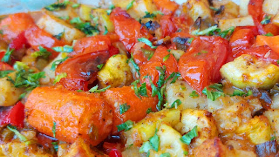 Tikvicu isecite na kockice posolite da odstoji pa ocedite višak tečnosti.U to ubacite šargarepu, krompir, beli luk, papriku, bibera, origana, mlevene crvene paprike i tucane.