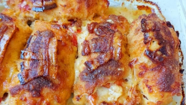 Ređati u podmazan pleh pa odozgo staviti listove slanine.