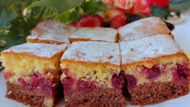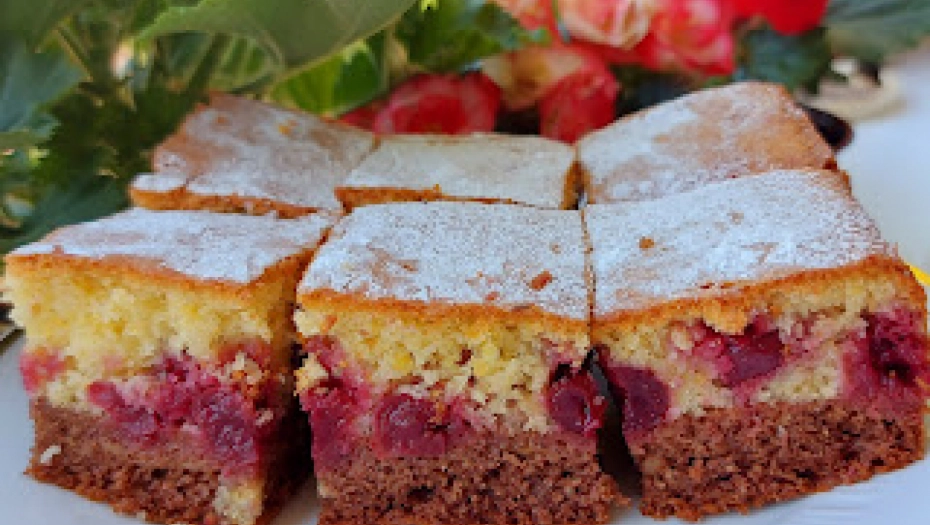 Peći na 200 stepeni C 6 minuta.Preko tamnog dela dodati voće, ja sam stavila višnje, pa sipati svetli deo i rasporediti.