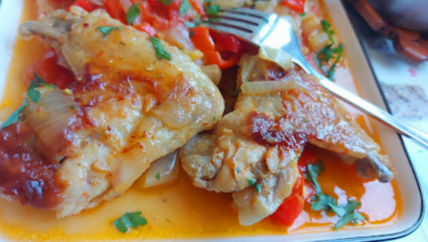 Kad se krilca isprže, dodati preko njih prženu papriku Oguliti paradajz iseći na kocke i ubaciti.