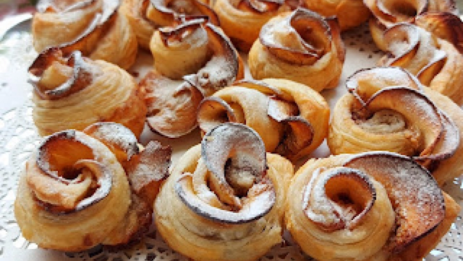 Jabuke iseći na tanke listiće (koristiti rende) i poredjati po mlevenim orasima duž. Malo saviti testo pri dnu pa uviti u ružicu kao što je prikazano u Videu.