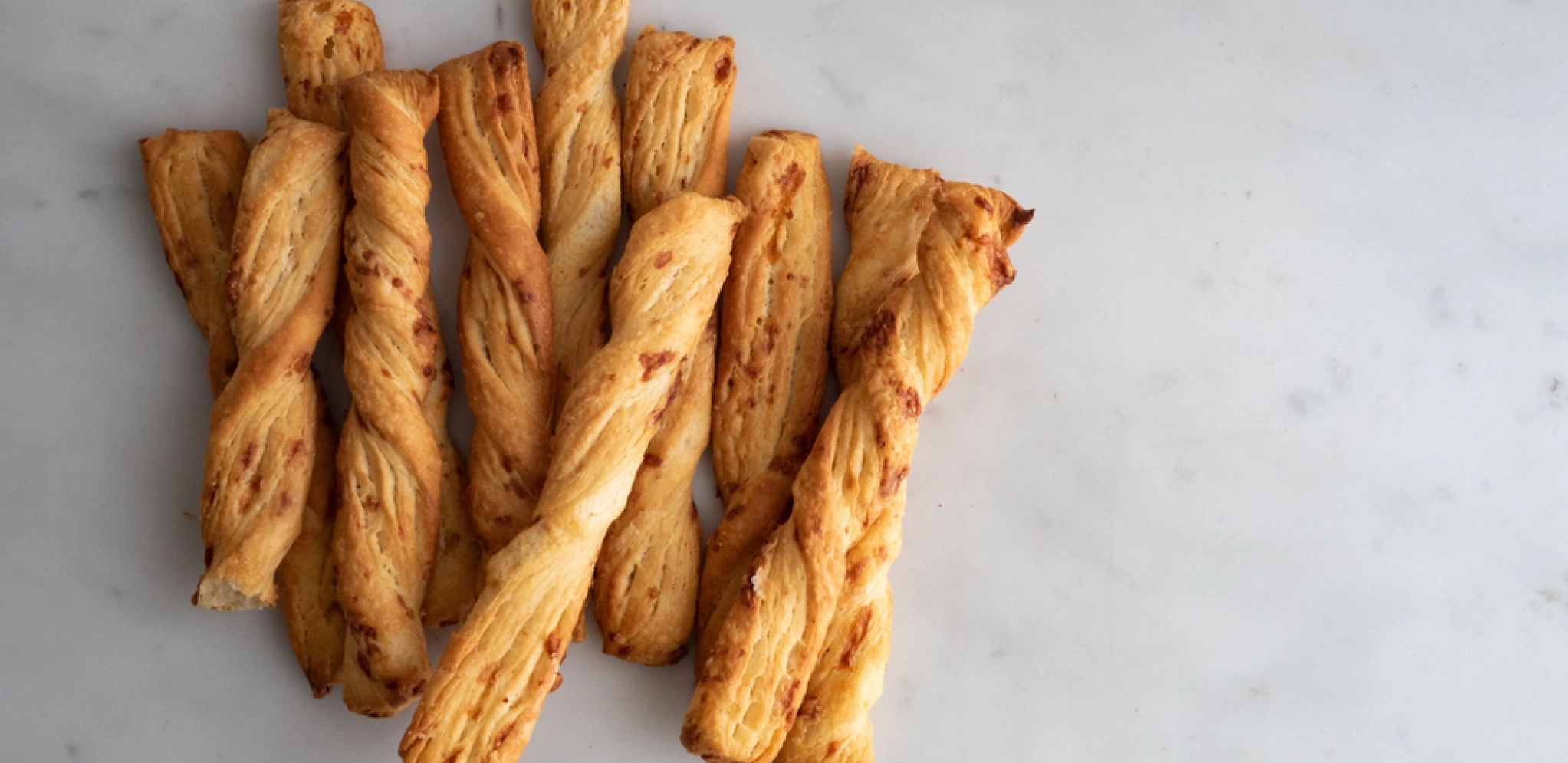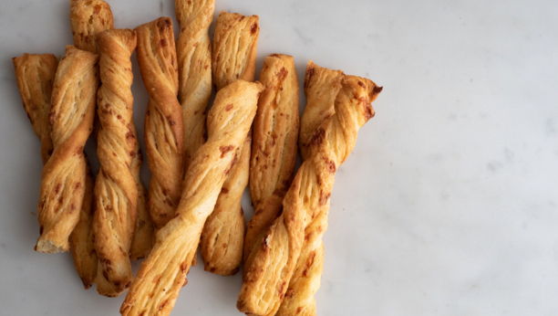 Na pobrašnjavljenoj podlozi oklagijom razvijte testo da bude debljine prsta. Oštrim nožem secite na trakice dužine oko 10 centimetara. Ređajte ih u pleh obložen pek papirom, ali ostavite malo razmaka imeđu svakog.