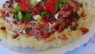 Na istoj ispržiti seckan luk i na kraju paradajz na kockice.Sve sipati u krug jedan do drugog.
