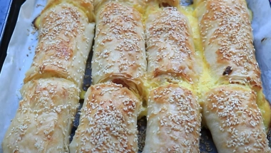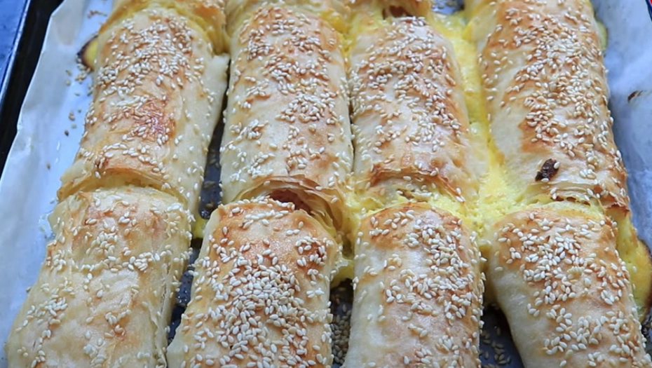 Saviti ivice i urolovati. Ređati na podmazan pleh. Kad ste potrošili sve rolnice iseći na željenu dužinu, premazati uljem i posuti po želji susamom.