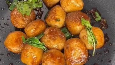 U tiganju zagrejte ulje, pa poslažite kuglice, dodajte beli luk, soja sos i ostale začine i pržite dok ne dobiju lepu, zlatnu boju.