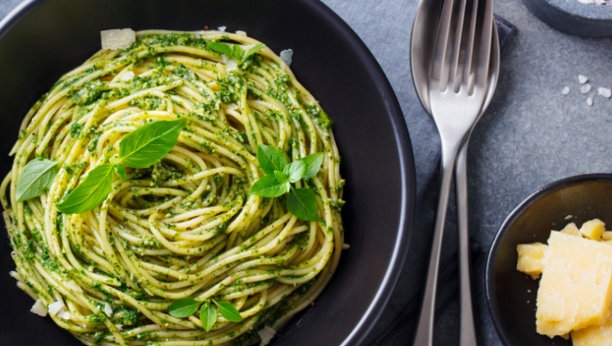 Za sos: stavite korijander, maslinovo ulje, pinjole, bijeli luk i začine u blender i napravite glatku smesu. Umešajte narendani sir.