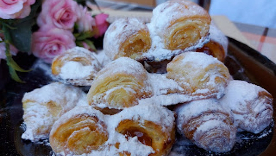 Ja sam jednostavno premazala džemom.Iseći točkićem na trake pa uvijati sa gornje i donje strane tako da se satavi na sredini. Ređati u obložen pleh papirom.