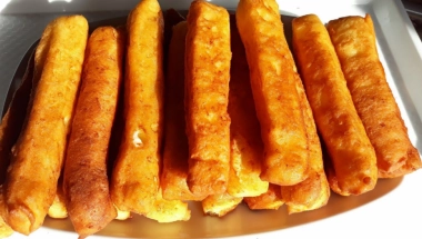 Samo nemojte da pritiskate da mnogo jer neće biti vazdušaste. Onako sve izrađujte ovlaš. Stavite u duboko ulje i pržite dok ne dobijete zlatno žutu boju. Mera je prava vašarska. Oni to zovu jedna tura testa.