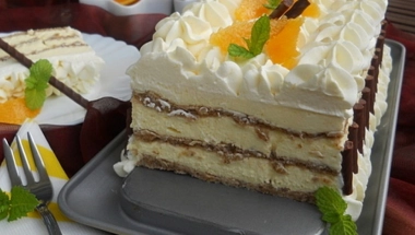 Podeliti smesu na 3 jednaka dela i rasporediti preko keksa. Umutite 2 sloja kreme od vanile prema uputstvu i njima ukrasite tortu. Upotpunite dekoraciju filetiranim narandžama, listićima nane i štapićima čokolade Ohladite tortu pre serviranja.