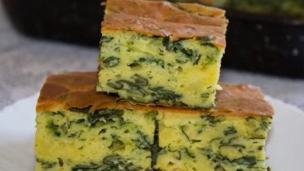 Smesu izlijemo u pleh obložen papirom za pečenje. Pečemo u već zagrejanoj rerni na 190 stepeni 30-40 minuta dok ne dobije lepu zlatno žutu boju.