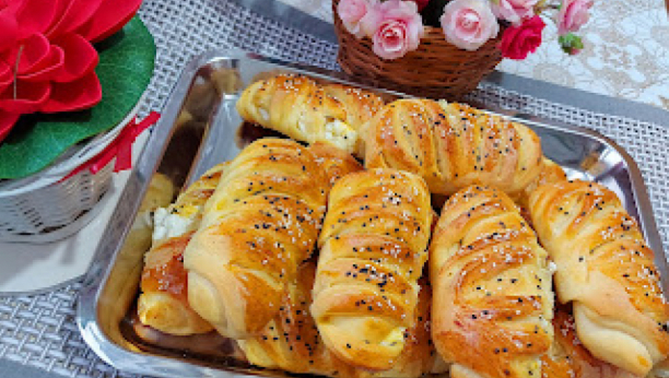 Donji deo isećić na uzane trake ali ne do kraja . Uviti u kiflice i ređati u podnazan pleh. Peći na 200 stepeni C 35-40 min. Pokrit da se prohlade i uživati u predivnom ukusu