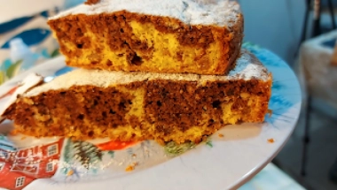 Malo izmešati kao mramorni kolač. Peći na 200 stepeni C oko 30 minuta. Po želji posuti prah šećerom ili preliti čokoladom.