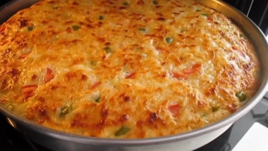 Na kraju dodajte brašno i prašak za pecivo. Kalup prečnika 32 cm premažite puterom. Sipajte smjesu, pospite rendani sir preko i pecite na 200°C nekih 30-35 minuta.
