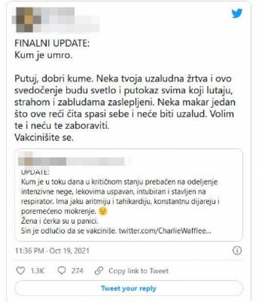 "Mesecima pokušavamo da urazumimo očevog kuma (67) i njegovu porodicu, ženu (61), sina (30), ćerku (32), i baku (92). Sin je mega-antivakser, svi nevakcinisani. On srce, šećer. Žena imuni sistem. Baka onkološki. Svi korona. Bože, pomozi im", bio je prvi u nizu tvitova na ovu temu, objavljen 7. oktobra.