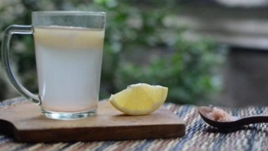 U loncu zagrejte 100 ml vode. Zatim sipajte vodu u čašu, pa dodajte pola kašičice morske soli i promešajte. U tu slanu vodu dodajte pola čaše prirodnog soka od jabuke, kašičicu rendanog đumbira i 2 kašike limunovog soka. Promešajte.