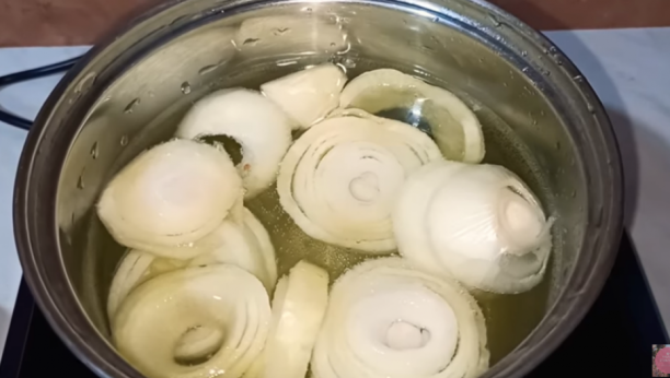 2. Glavice crvenog luka isecite na četvrtine, koren đumbira iseckajte i oba dodajte u šećernu vodu. Kada smesa ponovo provri, dodajte kurkumu i smanjite vatru na nisku temperaturu.