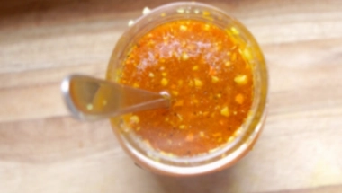 PRIPREMA: U šerpu sipajte vodu, šećer i stavite da provri. Dodajte očišćeni luk, isečen na četvrtine i narendani koren đumbira (veličine palca). Sipajte kurkumu i kada provri smanjite temperaturu. Kuvajte dok se količina ne smanji za polovinu. Procedite, sipajte u čistu staklenu teglu, a kada se potpuno ohladi, stavite u frižider.