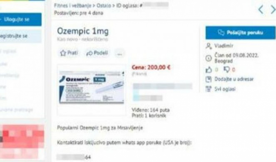 Na jednom portalu pojavio se oglas izvesnog Vladimira, koji je zahtevao da ga klijenti kontaktiraju isključivo preko WhatsApp-a, ali i američkog broja telefona. U njegovom oglasu je navedeno da lek "Ozempik" od jednog miligrama prodaje po ceni od 200 evra koji obećava ženama da će smršati i dovesti svoju liniju do savršenstva u kratkom vremenskom roku.