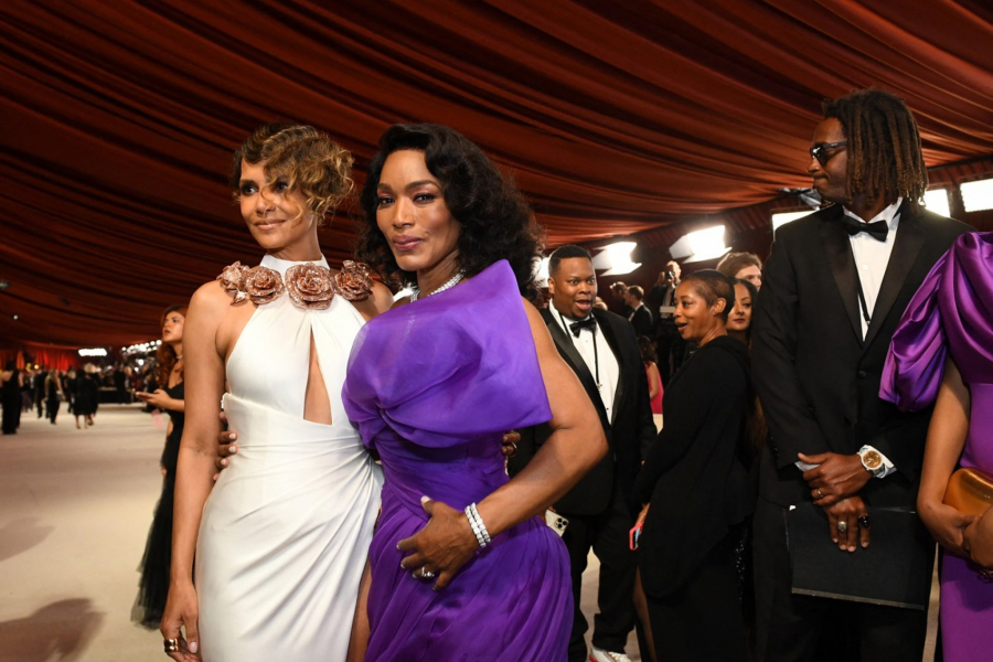 Izgledajući kraljevski, Angela Baset je za Moschino nosila kraljevsku ljubičastu haljinu otvorenih ramena sa preuveličanim dekolteom od mašne Džeremija Skota.