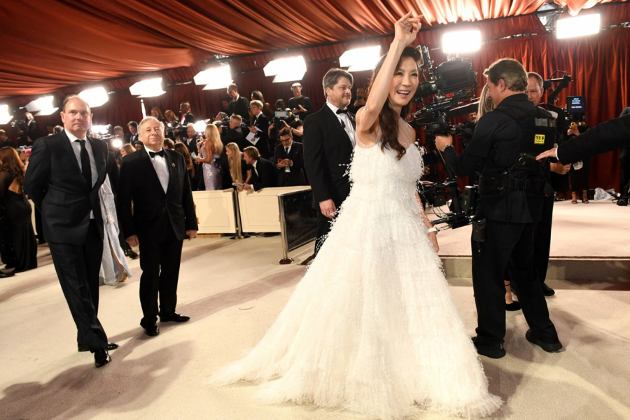 Hari Šam Jr. nosio beli smoking sa tamnoplavom ivicom sa obrubljenim strukom za osećaj istoka i zapada. Tepih nikada nije izgledao tako kraljevski, ili tako globalno.