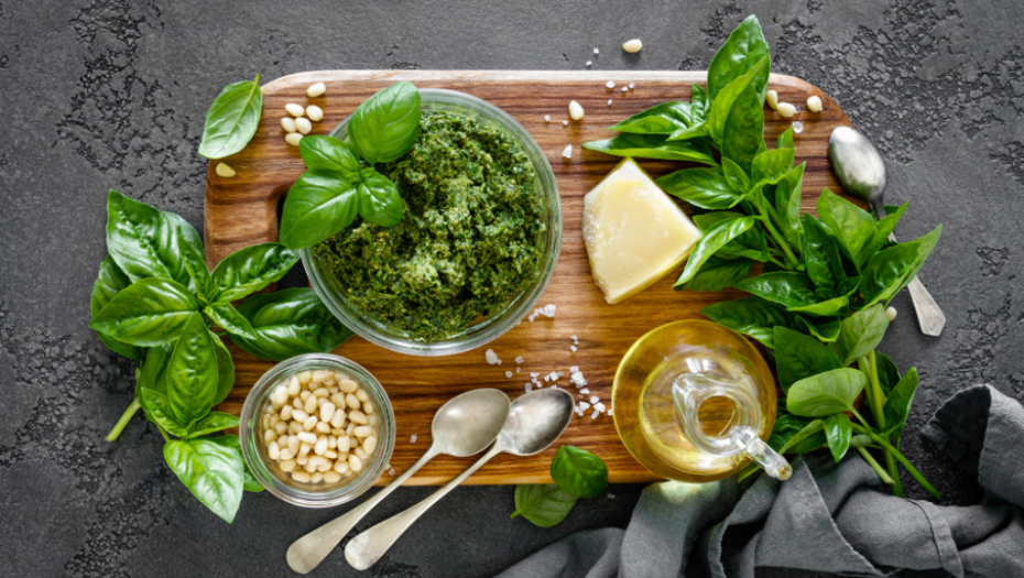Oprati i prosušiti bosiljak. Krupno narezati očišćen beli luk. Na mali tanjir narendati parmezan. U blender staviti sve sastojke: beli luk, bosiljak (cele stabljike), parmezan, pinjole, trećinu maslinovog ulja i prstohvat soli.