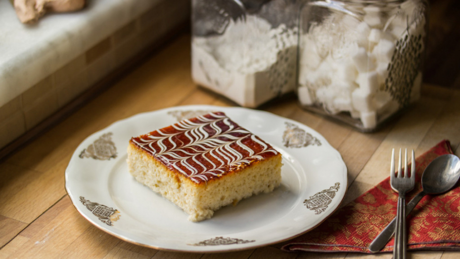 Sipati oko pola litra dobijene tečnosti u pleh i pažljivo vratiti još topli kolač preko mleka, i izbockati ga i sa gornje strane a onda ostatkom mleka polako preliti celi kolač. Iako izgleda da je mnogo mleka, ne sekirajte se sve će to kora upiti.